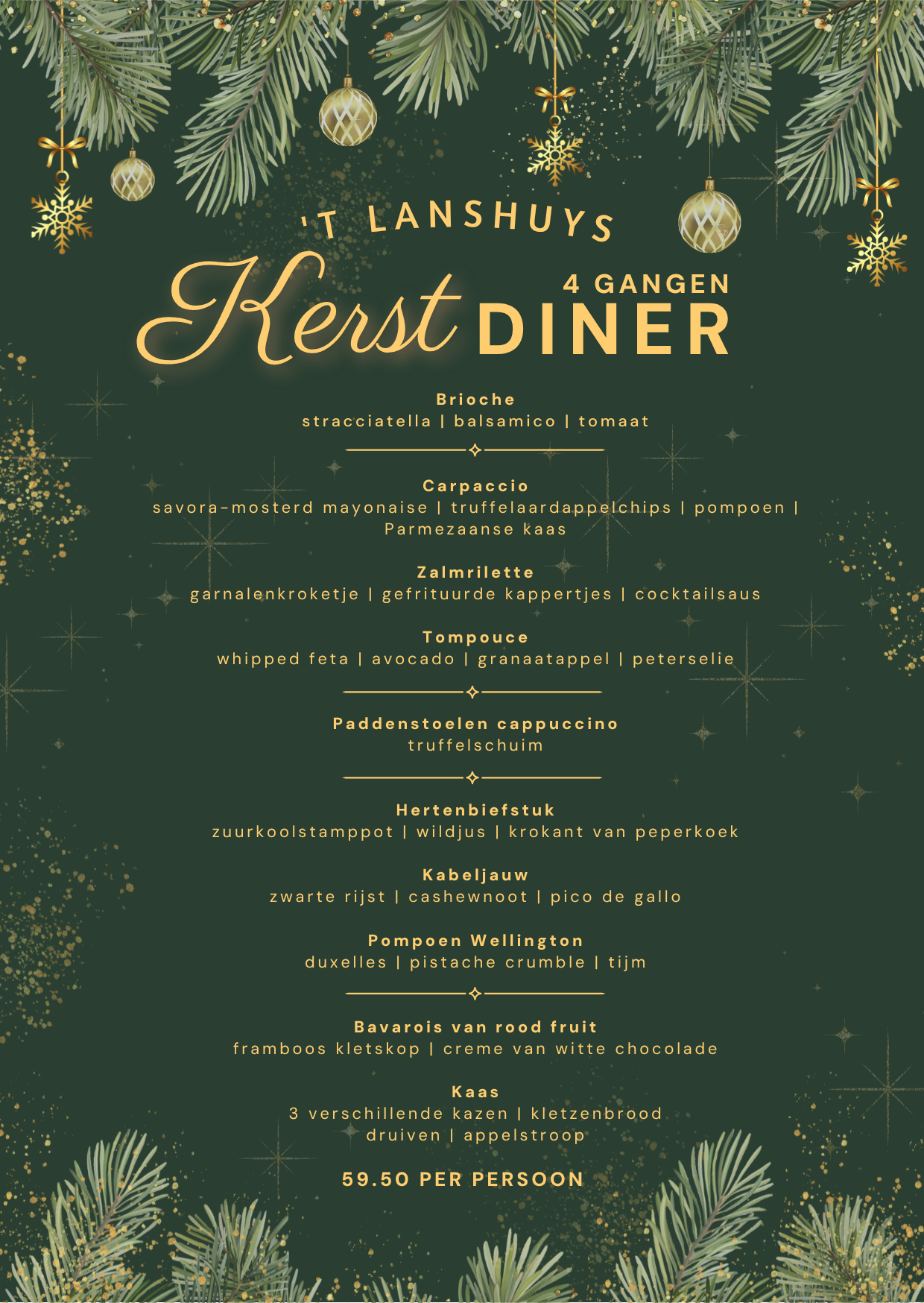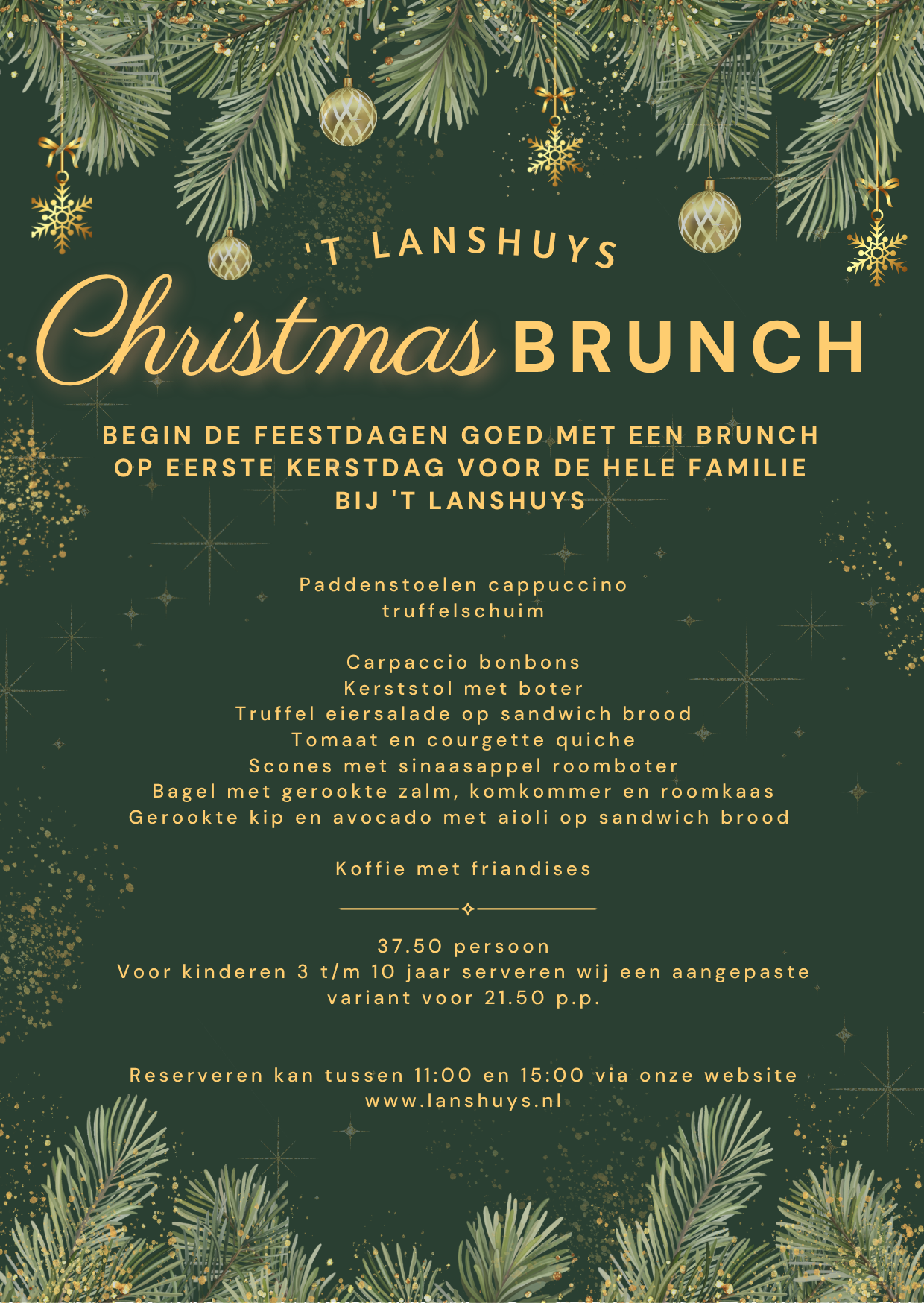 Begin eerste kerstdag goed met onze uitgebreide en feestelijke kerstbrunch. Schuif aan bij een rijkgevulde tafel vol heerlijke, verse lekkernijen. Van ambachtelijke broodsoorten en verfijnde koude gerechten tot warme verrassingen en zalige zoetigheden; alles is aanwezig voor een bourgondische start van de dag. De sfeervolle, huiselijke setting van ’t Lanshuys zorgt direct voor dat échte kerstgevoel.